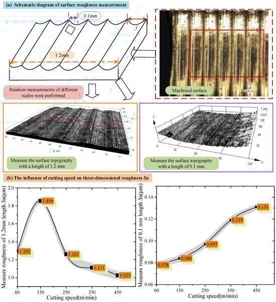 Three positions were randomly selected for surface quality inspection, with the inspection scales being 1.2 mm and 0.1 mm, respectively. The results are shown in Figure 3a. The test results of three-dimensional surface roughness and surface topography under different cutting speeds are shown in Figure 3b. It can be observed from Figure 3b that when the detection scale is greater than the feed rate (1.2 mm), the three-dimensional roughness of the surface shows a trend of first increasing and then decreasing with the increase in the cutting speed. At a larger detection scale, the influence of cutting speed on surface quality is rather complex. There may be a combined effect of multiple factors, resulting in the variation in three-dimensional surface roughness presenting nonlinear characteristics. When the detection scale is less than the feed rate (0.1 mm), the three-dimensional surface roughness increases with the increase in the cutting speed. It is indicated that at a smaller detection scale, the increase in the cutting speed will directly affect the microscopic accuracy of the surface, resulting in a continuous increase in the three-dimensional roughness of the surface.