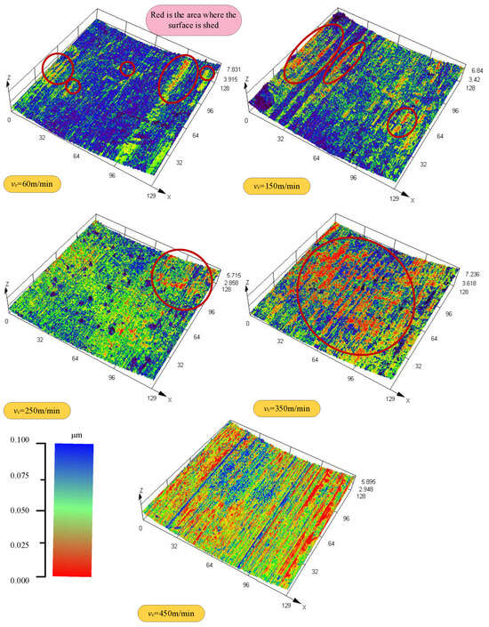 Under different cutting speeds, the cutting surface was randomly selected to detect the surface topography with a scale of 0.1 mm. The detection results are color-coded and rendered according to the surface’s roughness, as shown in Figure 4. Red represents low roughness, and blue represents high roughness. By observing graphic data, the influence of different cutting speeds on the topography of the cutting surface is evident. When the cutting speed is 60 m/min, the surface peeling area is relatively small, and the red area is dispersed, reflecting a slightly better surface quality and no apparent shedding phenomenon. With the cutting speed increasing to 150 m/min, the surface shedding area increases, the red area becomes concentrated, the surface quality decreases and the shedding phenomenon is clear. When the cutting speed is further increased to 250 m/min, the surface shedding area is further increased, the red area is concentrated, the surface quality further deteriorates, and the shedding phenomenon is severe. When the cutting speed is 350 m/min, the surface shedding area increases significantly, the red area is widely distributed, the surface quality decreases significantly, and the shedding phenomenon is severe. Finally, when the cutting speed reaches 450 m/min, the surface shedding area reaches its maximum size, the red area almost covers the entire surface, the surface quality is inferior, and the shedding phenomenon is severe.