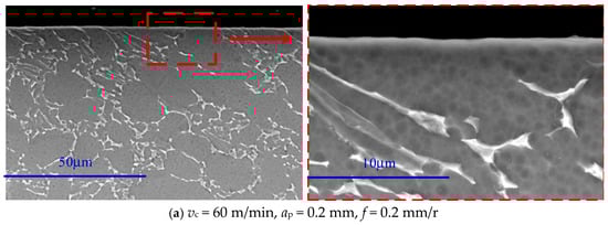 In the metal cutting process, the interaction between the tool and the workpiece material generates a cutting force and cutting heat, especially under high-speed cutting conditions, resulting in a large amount of heat energy being released. Under the cutting force, the workpiece material undergoes plastic deformation, and the cutting heat causes an increase in material temperature [12,13,14]. Under the intense friction between the tool and the surface of the workpiece, the surface material of the workpiece is rapidly deformed, and the combined action of the cutting force and heat leads to the extrusion and slip of the internal grain of the material, which then elongates, distorts, overturns and even breaks [15]. At the micron level, a surface metamorphic layer with different physical and chemical properties from the titanium alloy matrix is formed below the machined surface. The morphology, size, and orientation of grains in the microstructure of this metamorphic layer have changed significantly [16]. The microstructure of the metamorphic layer is different from that of the base material zone. The cutting surface layer mainly comprises surface morphology, an oxidation layer, a thermal deformation layer, a work hardening layer, and a residual stress layer [17,18,19].