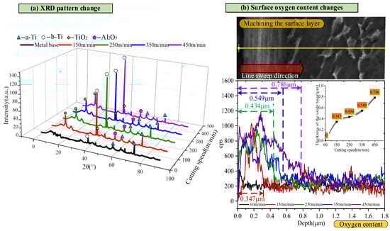 Due to the limited depth of XRD detection, this study draws on previous research results and considers the continuous oxygen penetration of titanium alloys under high-temperature oxidation conditions [25]. Therefore, a scanning electron microscope (SEM) was used to conduct the line scanning of the surface samples to determine the thickness of the oxygen permeation layer accurately. The scanning results (Figure 6b) clearly show that as the cutting speed increases, the thickness of the oxygen-permeable layer gradually increases. Its variation trend is the same as that of the thickness variation trend of the deteriorated layer detected by the scanning electron microscope, as shown in Figure 5. This result strongly suggests that the infiltration of oxygen causes the deterioration of the layer during the high-speed cutting process.