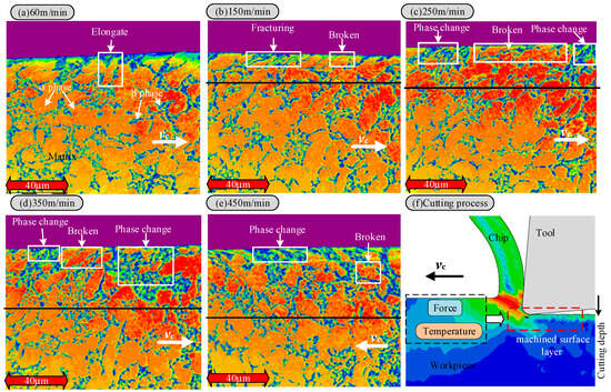 In order to further analyze the characteristics of the cutting metamorphic layer, the metallographic analysis of the cutting surface was carried out in this study. Figure 7a shows the cutting surface metallographic structure at a 60 m/min cutting speed. It can be seen from the figure that the surface grain elongates significantly at this velocity, forming a plastic deformation zone with pronounced directivity and a high dislocation density. No prominent phase change area indicates that the work hardening layer is the primary layer at this time. This phenomenon is due to the large cutting force and rapid heat loss experienced under low-speed cutting conditions, and mechanical deformation plays a leading role [28]. The high stress causes grain boundary slip and dislocation accumulation to form the work-hardened layer, while the residual stress is concentrated at the boundary of the metamorphic layer. When the cutting speed is increased to 150 m/min, the surface layer has an obvious metamorphic boundary, the surface grain is partially refined, and the dynamic recrystallization of small grains can be seen. This situation indicates that the work hardening and local recrystallization zones coexist at this time. With the increase in the thermo-mechanical coupling, the temperature of some regions reaches the critical value of dynamic recrystallization. When the cutting speed is further increased to 250 m/min, the thickness of the metamorphic layer continues to increase, the work-hardened layer almost disappears, and the phase change layer begins to dominate, with no cracks or holes appearing. It shows that the material is austenitized under high-speed cutting and high temperatures, and then martensitic transformation occurs during the cooling process [29]. When the cutting speed reaches 350 m/min and 450 m/min, there are more phase transitions in the surface layer, the thickness of the metamorphic layer increases further, and the broken phase also increases.
