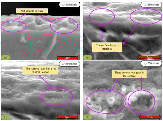 With the increase in cutting speed, the cutting area temperature increases significantly. This phenomenon is attributed to the extensive conversion of mechanical energy to thermal energy during the cutting process and the poor thermal conductivity of titanium alloy Ti6Al4V, which causes heat to accumulate in the cutting area. At high temperatures, titanium alloys react chemically with oxygen in the environment, resulting in surface oxidation. With a further increase in cutting speed, the cutting temperature rises, the oxidation reaction intensifies, and the oxide layer thickness increases correspondingly. The formation of the oxide layer changes the properties of the surface material and weakens its bonding strength with the base material. When the thickness of the oxide layer reaches a certain degree, under the action of cutting force, the oxide layer quickly falls off, resulting in defects on the machined surface and affecting the machining accuracy. This phenomenon is the main reason for the peeling phenomenon of the surface layer in Figure 4. The enlarged analysis of the metamorphic layer on the cutting surface shows that the surface topography presents an irregular structure (Figure 8a), stratification phenomenon (Figure 8b,c), and pores even appear in some areas (Figure 8d). All these factors reduce the binding force between the metamorphic layer and the substrate, thus causing the surface layer to fall off.
