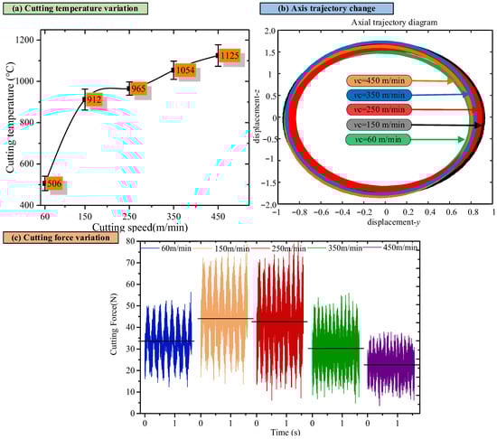 To further study the formation mechanism of the cutting metamorphic layer, the cutting force, cutting heat, and cutting vibration during the cutting process were systematically measured (Figure 9). The results show that with an increase in cutting speed, the cutting force and vibration acceleration initially increase and then decrease. This phenomenon can explain why the surface roughness fluctuates with the cutting speed at a larger detection scale (1.2 mm). The results show that, with an increase in cutting speed, the cutting force and vibration acceleration initially increase and then decrease. This phenomenon can explain why the surface roughness fluctuates with the cutting speed at a larger detection scale (1.2 mm). During low-speed cutting, as the cutting speed increases, the cutting force also increases. The increase in cutting force leads to an intensification of the contact deformation between the tool and the workpiece. During the cutting process, the cutting tool may generate slight displacements or vibrations, which can leave deeper scratches or ripples on the machined surface, thereby increasing the surface roughness [34,35].