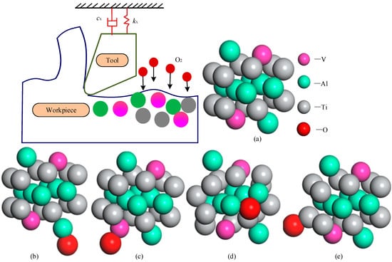 Model of oxygen migration in Ti6Al4V alloy system: (a) Ti6Al4V alloy system. (b) O migrates to Al. (c) O migrates to V. (d) O migrates to Ti1. (e) O migrates to Ti2.