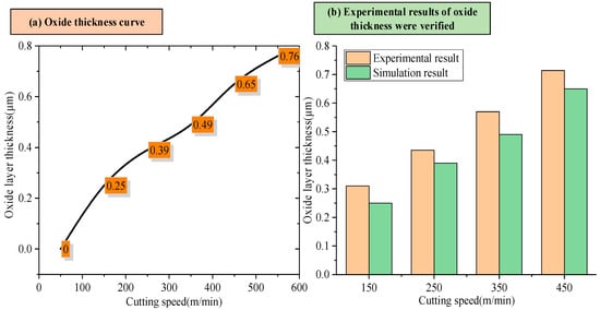 The calculated diffusion of activation energy is substituted into Equation (8). When the oxygen flux is zero, assuming no further diffusion of oxygen atoms, x represents the thickness of the oxide layer. At different cutting speeds, the thickness of the oxide layer is shown in Figure 11a. In order to verify the accuracy of the oxide layer prediction model, the calculated oxide layer thickness was compared to that obtained by SEM line scanning, and the comparison results are shown in Figure 11b. Compared with the experimental results, the error of the oxide layer prediction model established in this paper is less than 15%, indicating that the model can predict the oxide layer thickness of high-speed cutting titanium alloy.