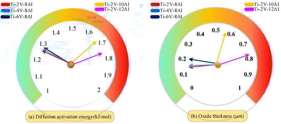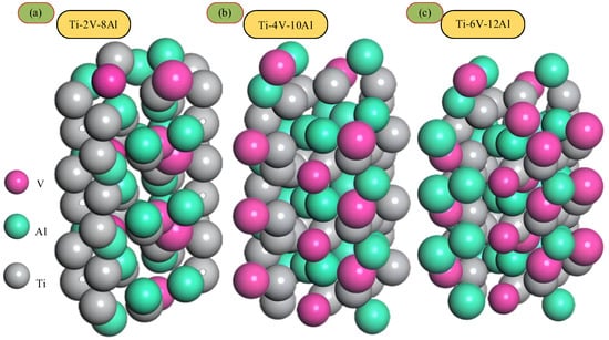 In order to study the influence of different component contents in titanium alloy on the formation mechanism of the oxide layer further, simulation experiments, as shown in Figure 12, were designed to calculate the diffusion activation energy and oxide layer thickness of titanium alloy oxygen under different element proportions. The Ti-Al alloy structure with significant element proportions is shown in Figure 12. The experimental results are shown in Figure 13. The analysis of Figure 13 shows that when the content of Al remains unchanged, the increase in the content of V causes a slight change in the diffusion activation energy and a slight increase in the thickness of the oxide layer. However, when element V’s content is low, and element Al’s content increases, the diffusion activation energy of the oxygen element gradually increases, and the thickness of the oxide layer also changes significantly. It can be seen that the increase in the Al content has a more significant effect on the diffusion activation energy of oxygen than the increase in the V content, which, in turn, has a more significant effect on the thickness of the oxide layer.