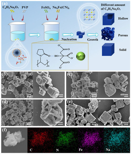 As shown in Figure 1a, the synthesis process of different forms of FeHCFs is schematically illustrated. In the solution, the PVP formed micelles were bound to citrates due to the electrostatic interaction, which then could work as templates to absorb Fe2+. Meanwhile, Fe2+ could chelate with citrates to reduce the nucleated rate of FeHCF through the competitive reaction with ferrous cyanides [27]. As shown in Figure 1b–e, different ratios of PVP to sodium citrate give different forms of FeHCF. When the ratio of PVP to sodium citrate is 3:4 (Figure 1b) or 3:7 (Figure 1c), the resulting materials show hollow cubic morphologies with particle sizes between 700 and 900 nm. In addition, the shells of some cubic particles are disappeared with their cavities exposed. When the ratio of PVP to sodium citrate is 3:10, the PB-3 particles show a dispersed cubic morphology with an open-pore skeletal structure (Figure 1d). The formation of this structure might be due to the addition of different amounts of sodium citrate, which changes the morphology of the micelles [28,29].