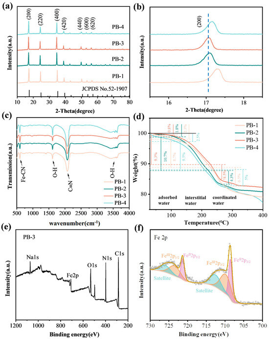 Figure 2c reveals that the four samples exhibit prominent absorption peaks primarily at 594.1 cm−1, 1618.3 cm−1, 2073.7 cm−1, and 3593.3 cm−1. In the infrared spectrum, the bands at 594.1 cm−1 and 2073.7 cm−1 can be attributed to the in-plane bending vibration and symmetric stretching vibration of the Fe-C≡N− moiety, respectively. The absorption bands at 1618.3 cm−1 and 3593.3 cm-1 correspond to the bending of the O-H bond and the stretching of the H-O bond in the H-O-H plane, respectively, which are related to the crystallization of water. In particular, PB-3 reveals the smallest peak at 3593.3 cm−1, which hints that PB-3 has less interstitial water and coordinated water in the crystal framework of PBAs.
