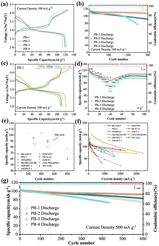 Electrochemical performance of four samples. (a) Cycle charge/discharge curve; (b) constant current discharge test at 100 mA g−1; (c) charge/discharge curves of the PB-3 electrode at 100 mA g−1; (d) rate performances of different four samples; (e) cycling performance and (f) rate performance of PB-3 electrode compared to previously reported Prussian blue cathodes; (g) long cycle performance at 500 mA g−1.