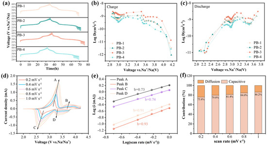(a) GITT profiles of four samples; (b) Na+ diffusion coefficient during charging process; (c) Na+ diffusion coefficient during discharge process; (d) cyclic voltammetry curves of PB-3 (A, B, C, and D represent the oxidation and reduction peaks in the CV curve of PB-3, respectively); (e) curve after linear fitting; (f) contribution ratios from the diffusion-controlled and capacitive processes of PB-3 at different scan rates.