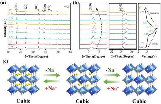 To reveal the sodium storage mechanism of PB-3 and to analyze the intrinsic reasons for the excellent electrochemical performance of this material at the crystal structure level, an ex situ XRD test was carried out within 2.0–4.2V (Figure 5a). As the charging process progresses, the diffraction peaks corresponding to the (200), (220), (400), (420), and (422) planes exhibit a gradual shift toward higher angles. Concurrently, the peaks at 16.8° and 24.5° show increased intensity. These observations indicate lattice contraction, likely caused by internal structural strain resulting from the extraction of sodium ions from the crystal framework. During the subsequent discharge progress, the diffraction peaks gradually shift towards lower 2θ values, and the lattice parameter gradually increases. It is noteworthy that the diffraction peaks of (200) and (400) return to the position of the initial charge at the end of the discharge, as shown in the magnified image (Figure 5b). At the same time, the diffraction peaks do not split significantly (except for 2.6 V and 2 V) and always maintain the cubic phase. This behavior can be attributed to the progressive reduction in lattice symmetry within the original cubic structure as Na+ ions accumulate in the lattice. The electrochemical potential variation induces a crystallographic phase transition from the cubic to rhombohedral structure, evidenced by the splitting of the (220) X-ray diffraction peak. A quantitative analysis reveals that charging to 2.6 V causes the (220) peak to decompose into two well-resolved peaks at 2θ = 18.2° and 18.8°, corresponding to the (111) and (222) reflections of the rhombohedral phase, respectively. Conversely, discharging to 2.0 V results in the recombination of these peaks, confirming the reversibility of the phase transition. This splitting phenomenon arises from the lattice parameter anisotropy during the cubic-to-rhombohedral transformation. The well-maintained lattice symmetry in the initial cubic framework (Figure 5c) suggests that the insertion/extraction of Na+ into the PB-3 lattice is highly reversible, which is favorable for the stability of the crystal structure during charging and discharging [43,50].
