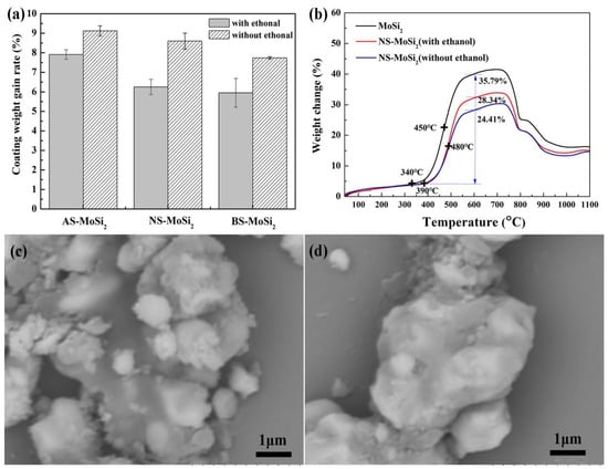 (a) Coating efficiency of AS-MoSi2, NS-MoSi2, and BS-MoSi2 fabricated via ethanol-mediated dispersion vs. direct mixing. (b) Comparative thermogravimetric (TG) curves of MoSi2 and NS-MoSi2 (ethanol-mediated vs. direct mixing). (c,d) Scanning electron microscopy (SEM) microstructures of NS-MoSi2 under different processing routes: (c) ethanol-mediated and (d) direct mixing.