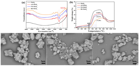 FTIR spectrum with red lines indicating the vibration frequency locations of Si–O–Si (a) and TG (b) curves of MoSi2, AS-MoSi2, NS-MoSi2, and BS-MoSi2, and SEM images of AS-MoSi2 (c), NS-MoSi2 (d) and BS-MoSi2 (e).