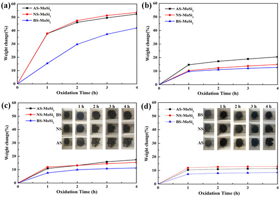 The isothermal cyclic oxidation behavior of AS-MoSi2, NS-MoSi2, and BS-MoSi2 at 400 °C (a), 500 °C (b), 600 °C (c), and 700 °C (d), with physical images of the samples in (c,d).