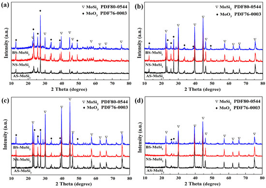 To investigate the surface chemical characteristics of MoSi2 before and after silica coating treatments, Fourier transform infrared spectroscopy (FTIR) was employed, and the spectra are shown in Figure 2a. The unmodified MoSi2 sample exhibited negligible absorption features across the measured spectral range (4000–400 cm−1), indicating minimal surface functionalization. In contrast, the coated samples (AS-MoSi2, NS-MoSi2, and BS-MoSi2) all displayed distinct absorption bands at approximately 1100 cm−1, 800 cm−1, and 475 cm−1, which correspond to the asymmetric stretching, symmetric stretching, and bending vibrations of the Si–O–Si network structure [29,30]. These findings confirm the successful formation of silica-based coatings on the MoSi2 particle surfaces.