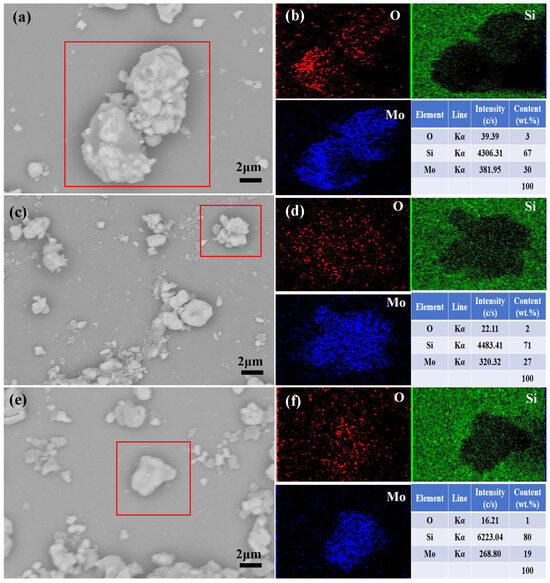 SEM with BSE imaging and EDS mapping of the particles in red squares with element contents of AS-MoSi2 (a,b), NS-MoSi2 (c,d), and BS-MoSi2 (e,f).