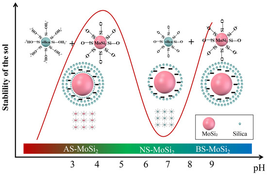 Firstly, the isoelectric point of MoSi2 is between pH 1–2, and the zeta potential of MoSi2 becomes more negative with increasing pH, indicating that MoSi2 is negatively charged in all three types of silica sol. MoSi2 has poor dispersibility and is prone to aggregation in acidic environments, while in alkaline environments, the dispersibility is better and the particles are easier to be encapsulated [27].