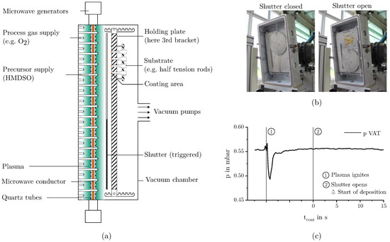 Figure 1. (a) Schematic sketch of the coating array; (b) deposition area with shutter closed (left) and opened (right); (c) qualitative pressure curve during deposition.