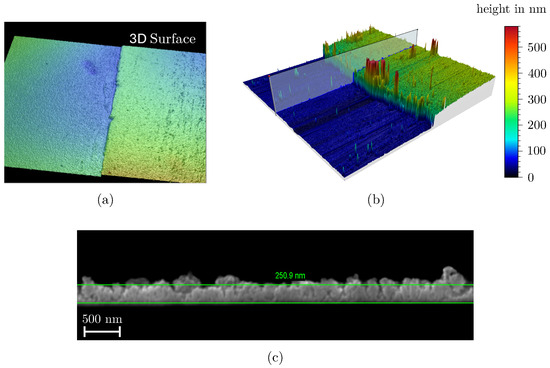 The film thickness h was determined on a NT 1100 Optical 3D Surface Profiler (Veeco Instruments Inc., Plainview, NY, USA) using white light interferometry. For this purpose, the microscopy glass slides were partially masked with polyimide adhesive tape during the coating process. After removing the adhesive tape, the samples were sputtered with a 40 nm thick gold–palladium film, which served as a reflective layer for the white light interferometry. Measurements were taken at three locations and then averaged. The substrate surface characterized by white light interferometry is shown in Figure 4a. To validate the accuracy of the measurements, selected data points were randomly cross-checked using atomic force microscopy (AFM), as illustrated in Figure 4b. Additionally, ion beam cross-sections were prepared for some of the films and compared with the white light interferometry results, as shown in Figure 4c. The deviation between the measurement methods was within the standard deviation of the mean value formation observed with the white light interferometry. Therefore, it was assumed that the thickness measurement using white light interferometry provides valid results, as AFM measurements and ion beam sections could only be carried out with some samples due to the high effort required.