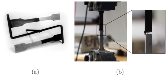 Figure 5. (a) Hybrid test specimens after demolding; (b) mechanical characterization according to ISO 6892 [46].