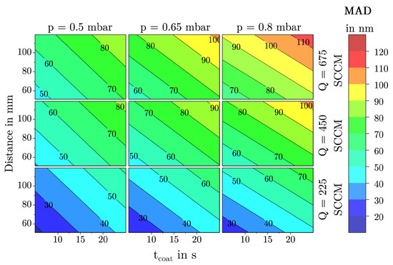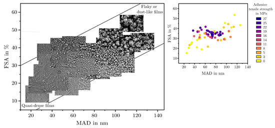 On the other hand, films with a high FSA can also form at high pressures and flow rates in combination with a large coating distance as shown in Figure 19d. In this case, a high FSA is associated with large MAD values and high deposition rates hence film thicknesses. As known from previous studies, such films exhibit a dust-like structure and are unsuitable as adhesion films.