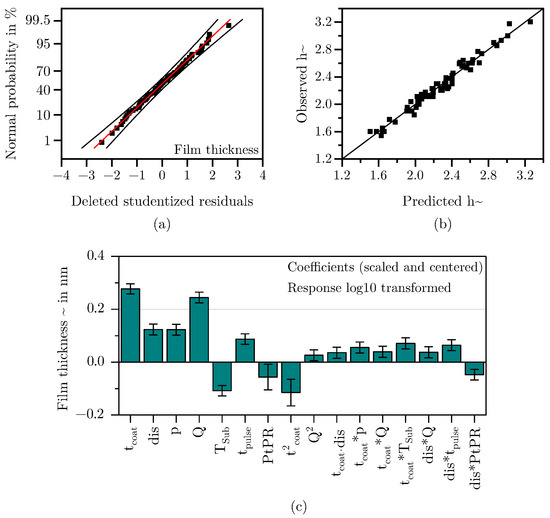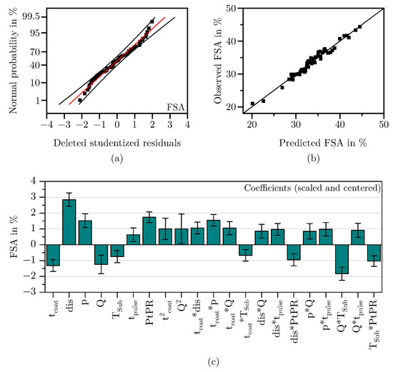 Figure 8a shows the deleted studentized residuals, ordered by size and plotted against their normal probability. Since they follow a straight line and no outliers exceed the ±4 SD mark, it can be assumed that the residuals are approximately normally distributed [48]. Additionally, Figure 8b demonstrates that the observed and predicted values of the model align well. With a Q2 of 0.91, an adjusted R2 of 0.96, and a model validity of 0.89 (see Table 3), it can be concluded that the selected predictors describe the response FSA well and that the model is of high quality [35].