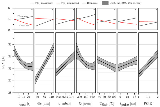 Figure 9. The lower part of the diagram shows a standard effect plot for the response FSA, illustrating the influence of the respective factor while all other variables are held at their center point. The upper part of the diagram presents the results of an extreme value analysis, displaying the effect of the respective factor when all other parameters are set to maximize or minimize its influence on the output variable. This corresponds to the maximum and minimum slope of the effect curve. If the sign of the slope changes within this range analysis, an asterisk symbol (*) is added in the upper right corner of the diagram, indicating a fundamental change in the factor’s effect.