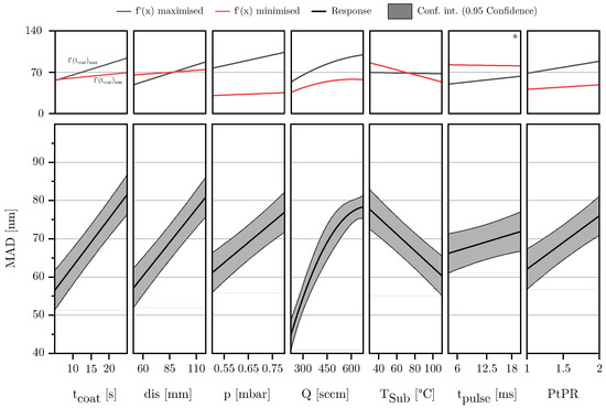 Fitting the models using MLR in combination with an augmented backward elimination approach, as described in Section 2.2, good regression models could be derived for all three responses: FSA, MAD, and h. Table 3 lists the coefficients along with their corresponding p-values. To check if the residuals are normally distributed, the deleted studentized residuals were ordered by size for each response and plotted against their normal probability. Considering seven input variables in each regression model complicates the presentation of the results. The regression models for the responses FSA, MAD, and h are presented graphically using effect plots. The plots display the respective response and the 95 percent confidence interval for each input variable, with all other variables fixed at their average values. For each input variable, the model was checked for fundamental changes in its trend within the investigated parameter space. By determining the largest gradient, parameter settings could be identified where the model is most sensitive to changes in each influencing variable. This involved deriving the model equation according to the main effect and performing an extreme value analysis to identify points of maximum or minimum rate of change. The responses at these points of maximum and minimum gradient are plotted in the upper part of the diagram. All input parameters that do not influence the slope gradient were set to their center point to improve comparability, as shown in Table 1. Responses that change algebraic signs within the analyzed parameter space are marked with an asterisk symbol (*). For these parameters, an extended analysis of the response is necessary to avoid drawing conclusions that are only valid in a specific model range.
