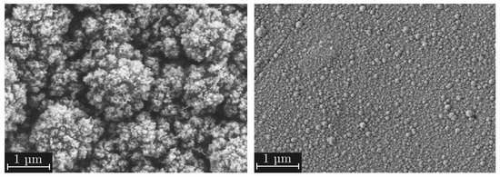 In order to analyze the deposited films for modeling precisely, the morphology was characterized by the parameters free surface area (FSA), mean agglomerate diameter (MAD), and film thickness h. The morphology of the deposited layers was characterized using automated image evaluation based on scanning electron microscopy (SEM) images. To obtain sharp images with high contrast and to prevent electric charging, it was necessary to sputter all samples for 20 s with gold–palladium (60 gold/40 palladium) before taking the SEM pictures. The sputtering was conducted under an argon atmosphere at 0.08 mbar chamber pressure and a current of 40 mA using a 208HR sputter coater from Cressington Scientific Instruments, Watford, UK. All images were taken with a Supra 55 VP SEM from ZEISS, Oberkochen, Germany. The exposure parameters were defined based on previously performed manual measurements of the agglomerate sizes. A complete analysis of the expected particle sizes required a magnification factor of twenty thousand at an image resolution of 1024 × 768 pixels. The operating distance was set to 3 mm, and the chamber pressure was set to values between 1 and 3 mbar. In order to display only the surface topography of the deposited layers, a secondary electron detector (SED) was used with a reasonably low acceleration voltage of 1 kV, according to the work of Zarraoa et al. [36] and Joy [37].