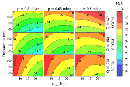 Within the analyzed model space, the distance exhibits the greatest effect on the FSA, highly interacting with the parameters t coat , Q, t pulse , and PtPR . This influence peaks at a combination of long coating times, high flow rates, long pulse durations, and low PtPRs. In contrast, it diminishes with opposite settings, resulting in a slight decrease in FSA with increasing coating distance.