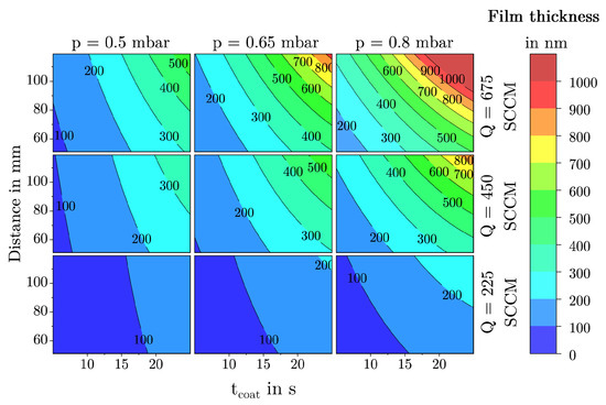 In order to describe the growth behavior of the mesoporous silicon dioxide-based thin films, a total of seven deposition parameters were varied in a statistically planned parameter study as can be seen in Table 1. The effect on film growth behavior was evaluated based on specifically defined film characteristics such as free surface area (FSA), mean agglomerate diameter (MAD), and film thickness (h), which are described in more detail in Section 2.3.
