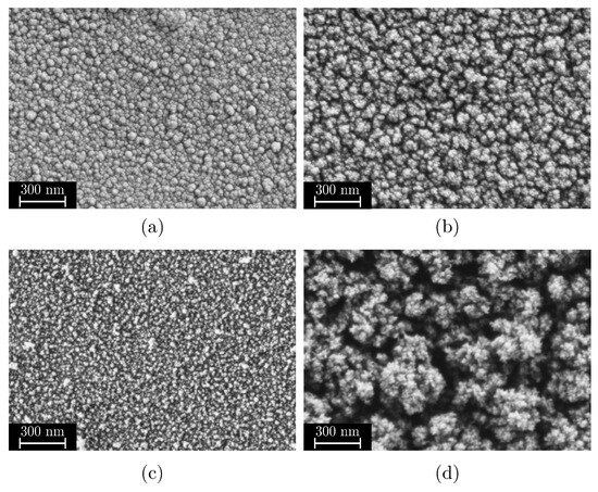 Figure 19. Change in film structure depending on the parameters t coat , dis , p and Q. (a) Quasi-dense structures with t coat = 25 s, dis = 51 mm, p = 0.5 mbar, Q = 225 SCCM. (b) Regular structures as reported in [16,22] with t coat = 15 s, dis = 85 mm, p = 0.65 mbar, Q = 450 SCCM. (c) High FSA composed of small agglomerates with t coat = 5 s, dis = 119 mm, p = 0.8 mbar, Q = 225 SCCM. (d) High FSA composed of dust-like structures with t coat = 25 s, dis = 119 mm, p = 0.8 mbar, Q = 675 SCCM.