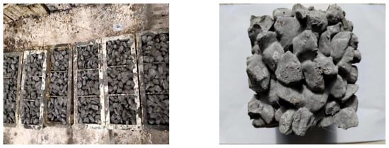 This study adopted a baseline mix proportion with a water-to-binder ratio of 0.3, a designed porosity of 27%, and a phosphogypsum replacement rate of 20% (corresponding to 63 kg/m3) to systematically investigate the effects of basalt fiber on the performance of phosphogypsum-based planting concrete. The length (6 mm and 18 mm) and dosage (0%, 0.5%, 1%, and 1.5% by mass of the cement–phosphogypsum binder) of basalt fiber were selected as variables. The selection of a 20% phosphogypsum replacement rate was informed by prior research from our group and supported by literature. Cheng et al. [27] demonstrated that this replacement rate significantly reduces concrete alkalinity, while maintaining adequate compressive strength. Furthermore, Zhang et al. [28] reported that a phosphogypsum dosage of 86 kg/m3 yielded compressive strengths of 18.2 MPa at 7 days and 22.6 MPa at 28 days, but higher dosages may compromise long-term durability due to excessive sulfate content. Liu et al. [29] indicated that increased phosphogypsum content elevates trace element levels, leading to toxicity that inhibits seed germination, thus justifying the 20% replacement rate as an optimal choice. For each mix proportion (as shown in Table 5), three specimens with dimensions of 150 mm × 150 mm × 150 mm were prepared and tested. The average value of the three specimens in each group was calculated as the test result to ensure reliability. The prepared phosphogypsum planting concrete specimens are shown in Figure 1.