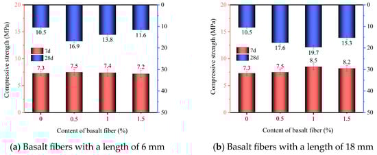 The 7-day and 28-day compressive strengths of phosphogypsum-based planting concrete incorporating basalt fibers are presented in Figure 2a and Figure 2b, respectively. These results illustrate the influence of different basalt fiber contents on the compressive strength of the material.