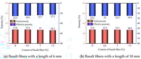 The effective and total porosities of phosphogypsum planting concrete incorporating 6 mm and 18 mm basalt fibers are illustrated in Figure 3a and Figure 3b, respectively. When no basalt fiber was added, the total porosity of the concrete was 27.6%. With the addition of 6 mm basalt fibers at the content of 0.5%, 1.0%, and 1.5%, the total porosity of the specimens decreased to 27.6%, 27.0%, and 26.2%. Compared to the control group, corresponding to reductions of 0%, 2.2%, and 5.1%, respectively. For 18 mm basalt fibers, the total porosity was reduced to 27.5%, 27.3%, and 26.8%, representing decreases of 0.3%, 1.1%, and 2.9%, respectively.
