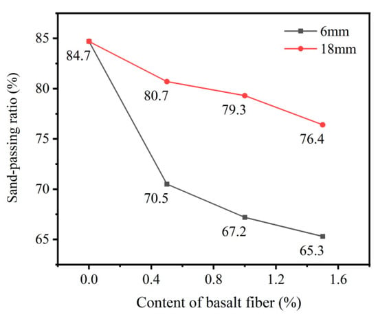 Notably, the reduction in sand-passing ratio was more pronounced in specimens with 6 mm fibers than those with 18 mm fibers. This was attributed to the ability of the longer 18 mm basalt fibers to form a more effective spatial network within the fresh concrete, which reduces the likelihood of slurry sedimentation [23,36,43].