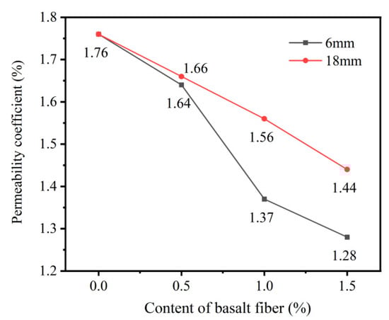 Furthermore, as shown in Figure 5, the permeability coefficient of phosphogypsum planting concrete decreases with increasing basalt fiber content. This reduction was attributed to the fact that basalt fibers occupy internal pores within the concrete matrix, thereby gradually reducing both total and effective porosity. Additionally, the spatial network formed by the basalt fibers increases the internal flow resistance, further contributing to the decrease in permeability. Moreover, compared to specimens incorporating 18 mm basalt fibers, those specimens with 6 mm fibers exhibited a more significant reduction in permeability coefficient. This trend is consistent with the variation observed in the sand-passing ratio.