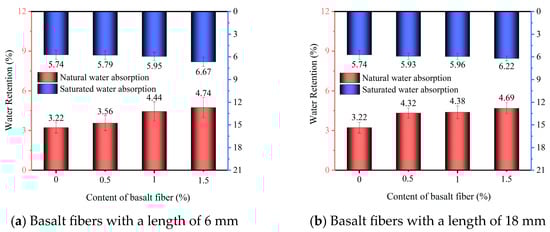 The natural and saturated water absorption capacities of the specimens with 6 mm and 18 mm basalt fibers are presented in Figure 6a and Figure 6b, respectively.