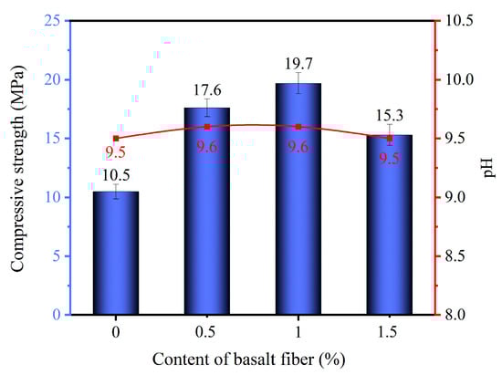 The alkalinity of phosphogypsum planting concrete reinforced with 18 mm basalt fibers was tested, and the results are shown in Figure 7. With increasing fiber content, both compressive strength and pH values initially increased and then decreased. Specifically, at fiber contents of 0.0%, 0.5%, 1.0%, and 1.5%, the corresponding pH values were 9.5, 9.6, 9.6, and 9.5, respectively.