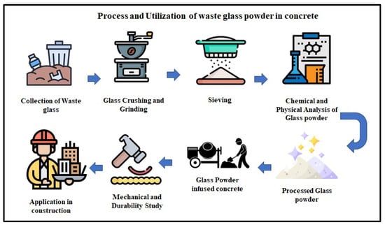 Several investigations have documented the beneficial impacts of WGP in concrete. The strength and durability, as well as the mechanical characteristics, of concrete can be improved by substituting cement with WGP at different ratios. Nevertheless, if the WGP content is excessively increased, difficulties may arise due to a lack of cohesiveness, as well as possible adverse effects from the alkali–silica reaction [17]. With increasing construction work worldwide, finding new sustainable options for traditional materials is crucial. The use of industrial and post-consumer waste in construction work is beginning to be viewed as one approach to alleviating environmental problems and safeguarding natural resources. WGP has emerged prominently among such materials because of its capability to serve as a partial substitute for cement and fine aggregates in concrete. WGP is derived from waste glass cullets, a byproduct of cities and industries. This complements the growing demand for a circular economy, where waste is utilized as a substitute for raw materials [18]. Studies show that WGP’s effectiveness in improving concrete performance greatly depends on its chemical and physical features. With a silica (SiO2) content typically exceeding 70%, WGP exhibits pozzolanic characteristics that enable it to react with calcium hydroxide in the cement, producing more calcium silicate hydrate (C-S-H). This contributes to the tremendous increase in concrete’s mechanical strength and durability over time [19]. Additionally, the acceptable size of the WGP increases its surface area, thereby enhancing the reactivity of the WGP to cementitious systems. This improvement in reactivity reduces the likelihood of alkali–silica reaction (ASR), which is typically a problem associated with larger glass particles [20]. Figure 1 illustrates the systematic stages of WGP collection, processing, and incorporation into concrete. It emphasizes processes critical for creating environmentally friendly concrete products, such as glass crushing, particle size classification, chemical testing, and mechanical testing.