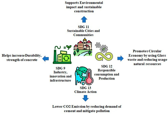Sustainability impact of waste glass powder utilization in concrete, highlighting its contribution to SDG 9, SDG 11, SDG 12, and SDG 13.