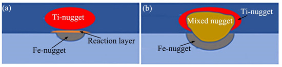 Schematic diagram of the Ti/steel joint; (a) joint with DS-nugget; and (b) joint with C-nugget.