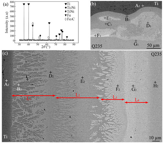 Due to the long duration of high temperatures in the center zone of the weld, Ni and Ti atoms diffused fully to the steel side, and Fe atoms diffused into the liquid phase. After solidification, a multi-layer structure, as shown in Figure 4c, was formed. Based on the EDS results, it can be inferred that the L1, L2, L3, and L4 layers were primarily composed of (α-Ti) + Ti2Ni, TiNi, TiNi + Ti(Ni, Fe)3, and (Fe, Ni), respectively. Yu et al. employed MSC Marc software to simulate the temperature field during RSW between a 2 mm thick steel plate and a 2 mm thick titanium alloy plate, using a Ni-Cu alloy as the interlayer [17]. The simulation results indicated that the peak temperature on the steel side was lower than that on the titanium alloy side [17]. During the cooling process, therefore, on the side adjacent to the steel where diffused Ni and Ti atoms were present, an (Fe, Ni) solid solution layer (L4 layer) was formed as the temperature decreased. Subsequently, the temperature continued to decrease, and a eutectic reaction occurred at the front of the L4 layer, leading to the formation of TiNi and a Ti(Ni, Fe)3 eutectic structure layer (L3 layer). Here, owing to the relatively scarce formation of Ti(Ni, Fe)3, its presence was not detectable by XRD. Then, at the forefront of the L3 layer, a solid–liquid phase transformation occurred, resulting in the formation of the TiNi layer (L2 layer). Meanwhile, (β-Ti) was initially precipitated near the Ti side, with Ni atoms being expelled to the surrounding regions. As the temperature continued to decrease, a eutectic transformation occurred, resulting in the formation of (β-T) + Ti2Ni. Then, β-Ti transformed to (α-Ti) + Ti2Ni (eutectoid reaction).