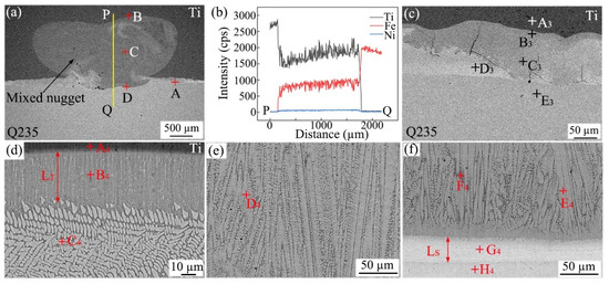 The SEM images and EDS results of the Ti/steel joint with the C-nugget: (a) SEM image of the cross-section; (b) EDS results; and (c–f) show an enlarged image taken from A, B, C and, respectively.