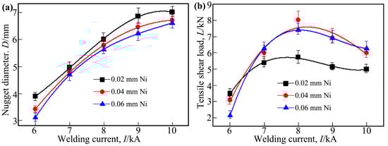 The effect of the welding current on the nugget diameter and tensile shear load of the Ti/steel joint; (a) nugget diameter; (b) tensile shear load.