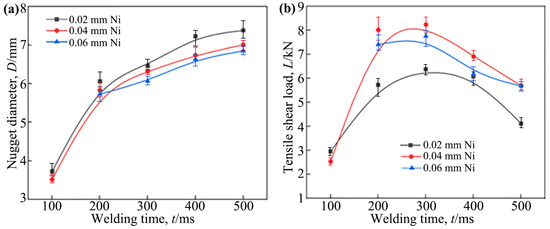 The effect of the welding time on the nugget diameter and tensile shear load of the Ti/steel joint: (a) nugget diameter; (b) tensile shear load.