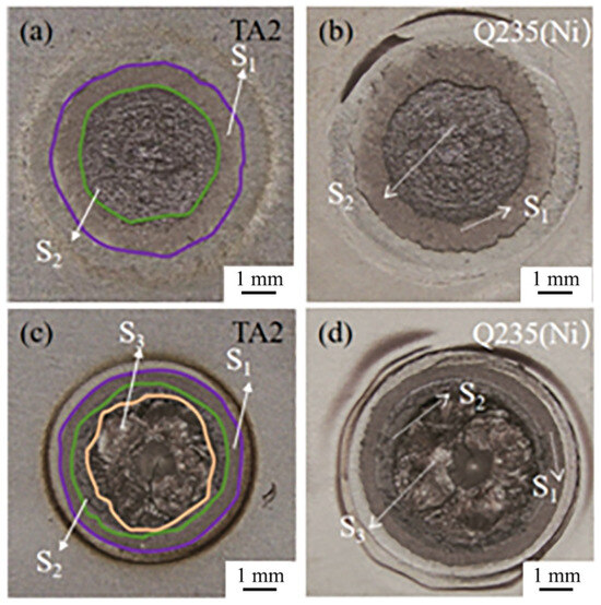Figure 8 shows the fractures of the Ti/steel joints. Figure 8a,b illustrate the fracture surfaces on the Ti side and steel side of the joint containing the DS-nugget, respectively. This joint was produced under the following welding conditions: a welding current of 7 kA, a welding time of 200 ms, an electrode pressure of 3 kN, and an interlayer thickness of 0.04 mm. According to their morphological characteristics, macroscopically, fractures can be categorized into two distinct regions: the annular region located at the periphery of the fracture and the circular region situated at the center of the fracture. Figure 9a1–d1,a2–d2 present the EDS analysis results obtained from the local regions of the steel side and Ti side fracture surfaces for the Ti/steel joint containing the DS-nugget, respectively. As shown, Ni was predominantly detected in the annular region on the fracture surfaces of both the steel side and the Ti side. The annular region is designated as the S1 region. In circular regions, Ti and Ni were identified on both the steel and Ti sides of the fracture surfaces. The circular region is defined as the S2 region.