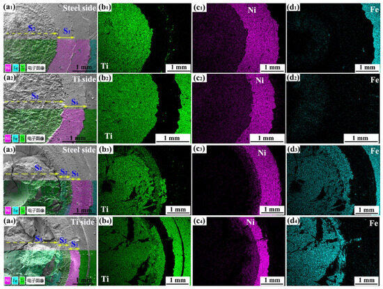 EDS results for the fractures: (a1–a4) composite image of SEM- and EDS-layered images for the steel and Ti sides of the joint with DS-nugget and C-nugget; (b1–b4) the distribution of Ti on the fractures of steel and Ti sides of the joint with DS-nugget and C-nugget; (c1–c4) the distribution of Ni on the fractures of steel and Ti sides of the joint with DS-nugget and C-nugget; and (d1–d4) the distribution of Fe on the fractures of steel and Ti sides of the joint with DS-nugget and C-nugget. The Chinese characters in the picture are translated as “electronic image”.