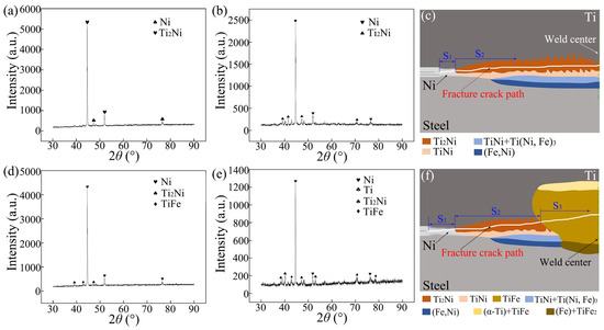 Figure 10d,e present the XRD analysis results obtained from the fracture surfaces on the steel side and the Ti side of the joint with the C-nugget, respectively. Ni, Ti2Ni, and TiFe were identified on the fracture surface of the steel side, while Ni, Ti, and the compounds Ti2Ni and TiFe were also detected on the titanium fracture surface. Similarly, the schematic diagram of the fracture crack propagation path in the joint with the C-nugget during the tensile shear test was established, as depicted in Figure 10f. For the Ti/steel joint with the C-nugget, the initiation of the fracture crack and its propagation at the edge of the welding zone are comparable to those observed in the Ti/steel joint containing the DS-nugget. When the fracture crack extended into the mixed nugget, it continued to propagate through the more brittle TiFe layer, as shown in Figure 10f. The failure of the Ti/steel joint occurred within the Ni interlayer, the Ti2Ni layer, and the TiFe layer, corresponding to regions S1, S2, and S3, respectively, as indicated in Figure 10f.