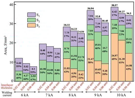 The area of each region was quantitatively measured on the fracture images of the Ti/steel joint. Figure 11 illustrates the measured areas of the S1, S2, and S3 regions on the fracture surfaces of each joint, along with their respective proportions. Although the S1, S2, and S3 regions of the joint may contain small amounts of other phases in addition to their primary constituents—Ni, Ti2Ni, and TiFe, respectively—in order to provide a rough estimation of each region’s contribution to the tensile shear load of the Ti/steel joint, it was assumed that the stresses within these regions remained constant across all joints, denoted by σ1, σ2, and σ3, respectively. The values of σ1, σ2, and σ3 were calculated using the least square method as described below [20].